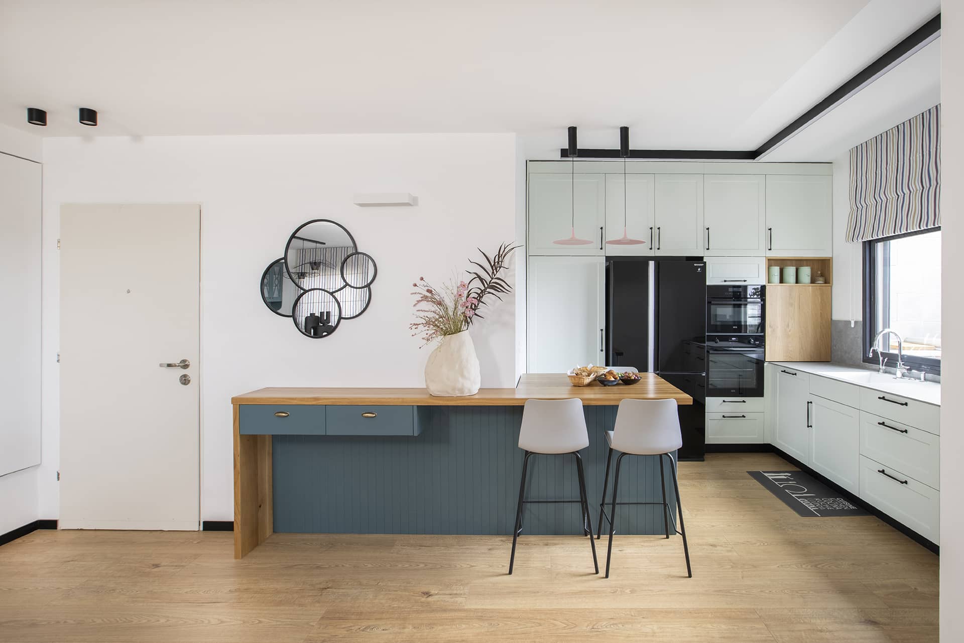 Sur le mur d'entrée de l'appartement se trouve également une console qui continue et se connecte à l'espace cuisine à l'arrière de l'appartement et n'est que partiellement visible depuis l'espace public : « Le mobilier que nous avons conçu se transforme en comptoir repas dans le coin cuisine qui comprend des espaces de rangement et dans la foulée j'ai créé un mur haut et un plan de travail suffisamment grand pour les préparations et la cuisson. Les couleurs sont majoritairement claires (teinte menthe clair) Et cela intensifie la dimension de la lumière. Nous l'avons assorti avec des éléments en bois, cela ajoute de la chaleur ».
