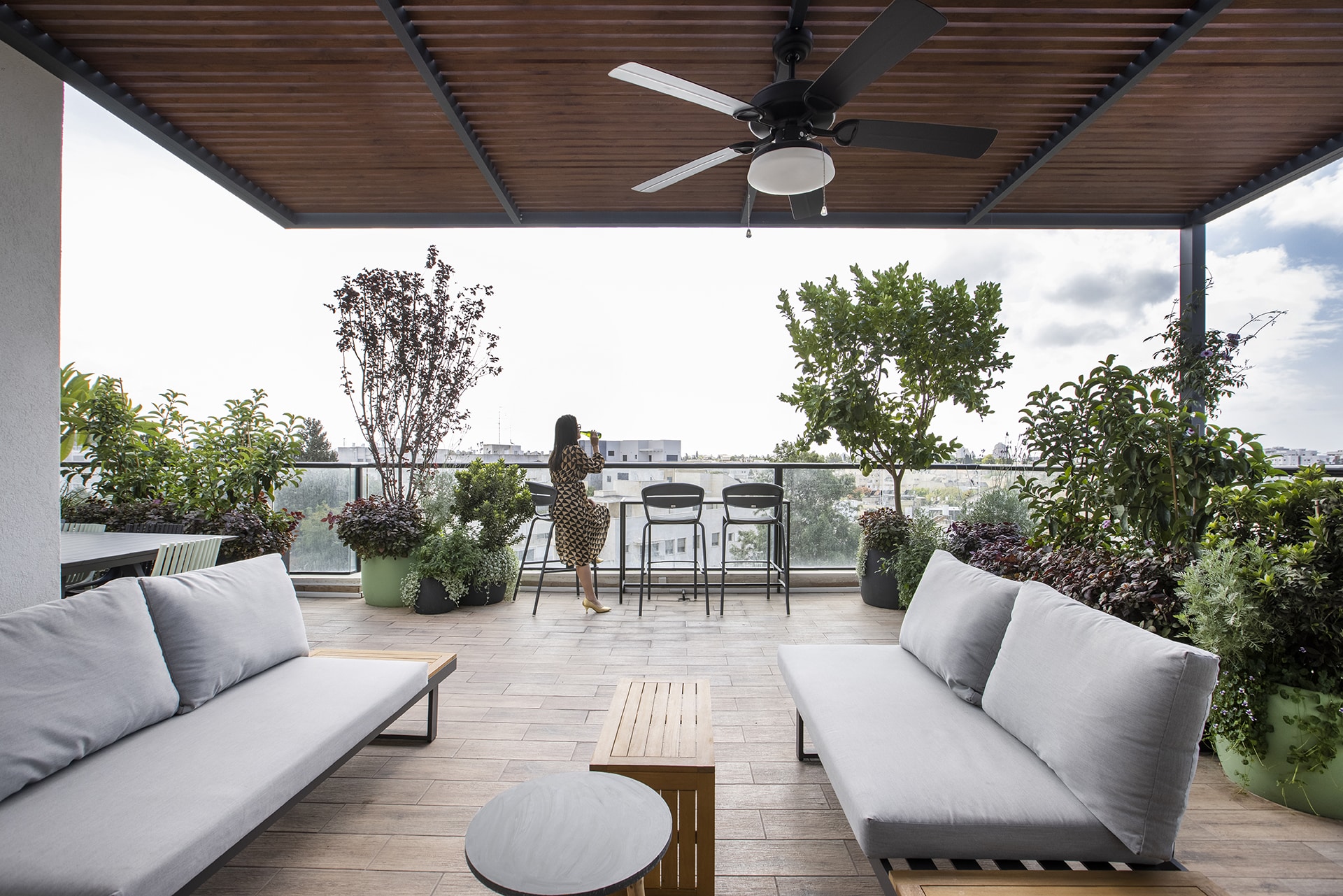 La sortie sur le grand balcon se fait par la baie vitrée du salon : "Dans le gros œuvre, nous avons intégré des jardinières avec une finition en béton – un choix qui met en valeur la diversité végétale qui comprend des arbres fruitiers, des buissons fleuris et des plantes à épices. Nous avons choisi de paver toute la zone avec des carreaux de granit céramique imitation parquet qui poursuivent le concept de design de l'appartement. J'ai planifié la cuisine d’extérieur et le stand B.B.Q près de la fenêtre de la cuisine intérieure afin d'optimiser le travail entre l'extérieur et l'intérieur – de cette façon, vous pouvez déplacer les produits et accessoires directement et sans déplacements intempestifs. Le couple et les invités bénéficient également d'un grand coin repas, d'un coin salon et d'un comptoir de bar installé dans la balustrade et donnant sur le paysage urbain. "