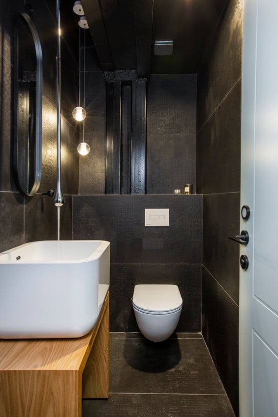 עיצבנו שירותי אורחים דרמתיים, והעלינו את חדר הכביסה לקומת הכניסה למטרת נוחות מירבית.