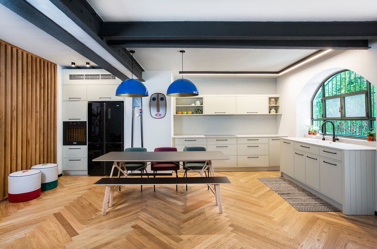 במהלך שיפוץ הדירה החלטנו לחשוף קורות ועמודים נסתרים בבית, שהיו מכוסים בהנמכות גבס, כדי ליהנות מהאלמנט העיצובי.