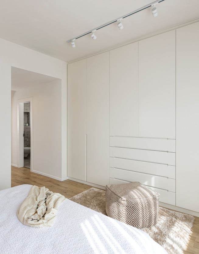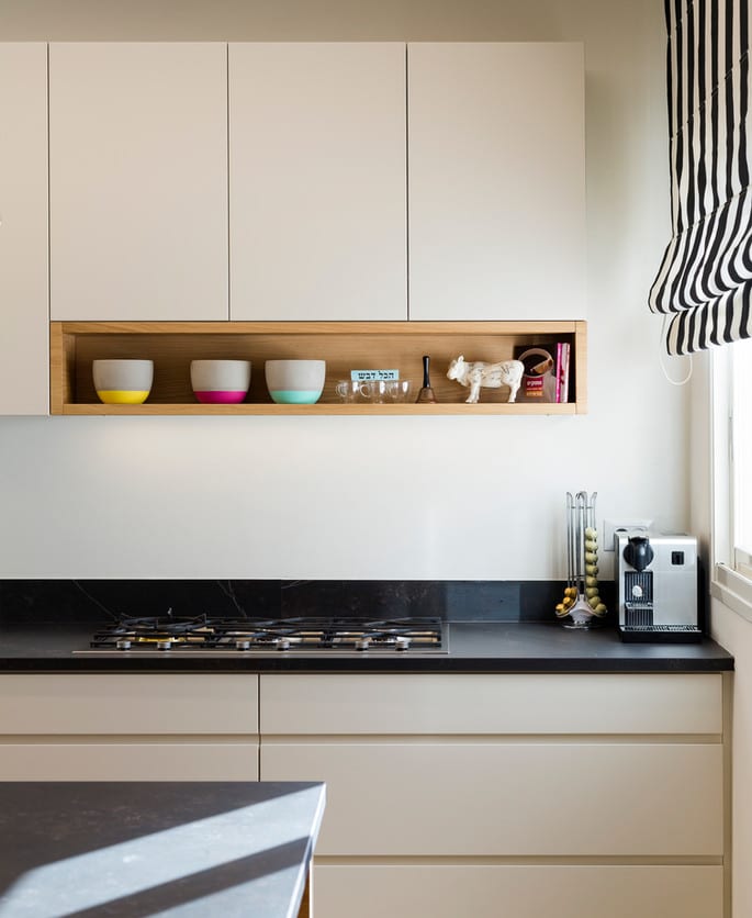 כחלק מתהליך העיצוב תכננו מחדש את המטבח, את פרטי הנגרות בסלון, את פינת האוכל וחדרי הרחצה. חדר האמבטיה המיועד לילדים כלל במקור מקלחון ועל כן אינו יעיל לילדיהם הקטנים. הרחבנו אותו על חשבון מסתור כביסה ישן וכך הרווחנו מקלחת מרווחת, ארון איחסון גדול וארון יעודי למכונה ולמייבש כביסה. את חדר הרחצה של בני הזוג הגדלנו על חשבון חדר השינה, מבלי לפגוע בפונקציונליות ובאסתטיקה שלו, כך יצרנו עבורם מקלחון מפנק במרכזו ראש מפל גשם שמאפשר להם להרגע בתום יום ארוך ומפרך.