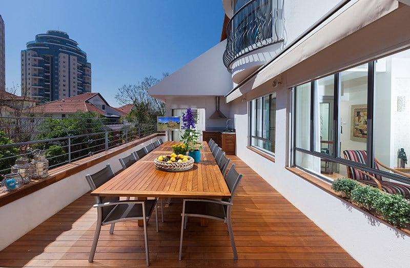 מרפסת האירוח רחבת הידיים מהווה ציר חשוב ומרכזי עבור בני הזוג שמרבים לארח את בני משפחתם וחברים. שילבנו בה פונקציות אירוח שונות בהם מסך טלוויזיה גדול, פינת אוכל גדולה וכן מטבח חוץ מאובזר.