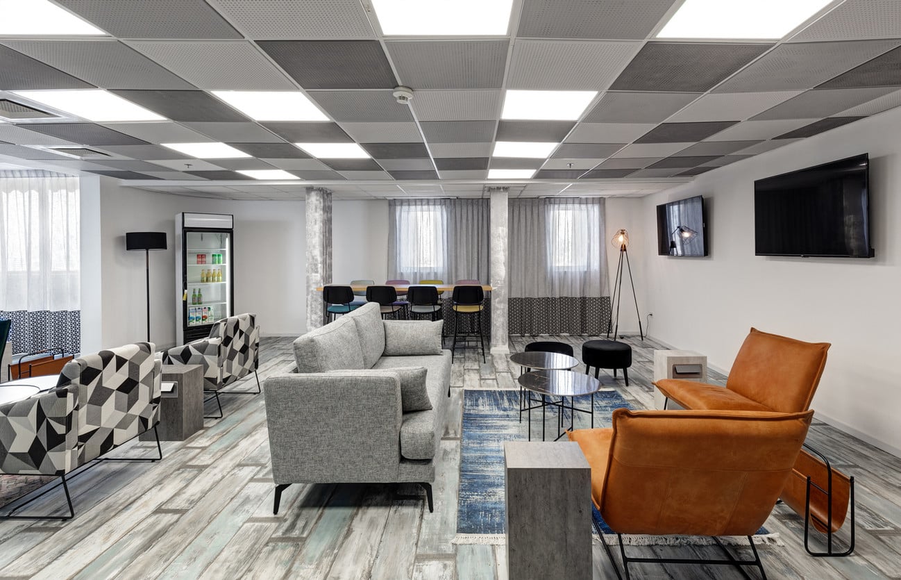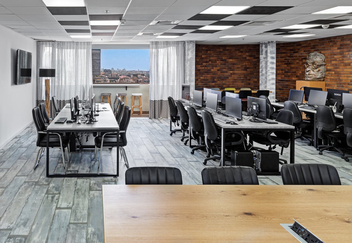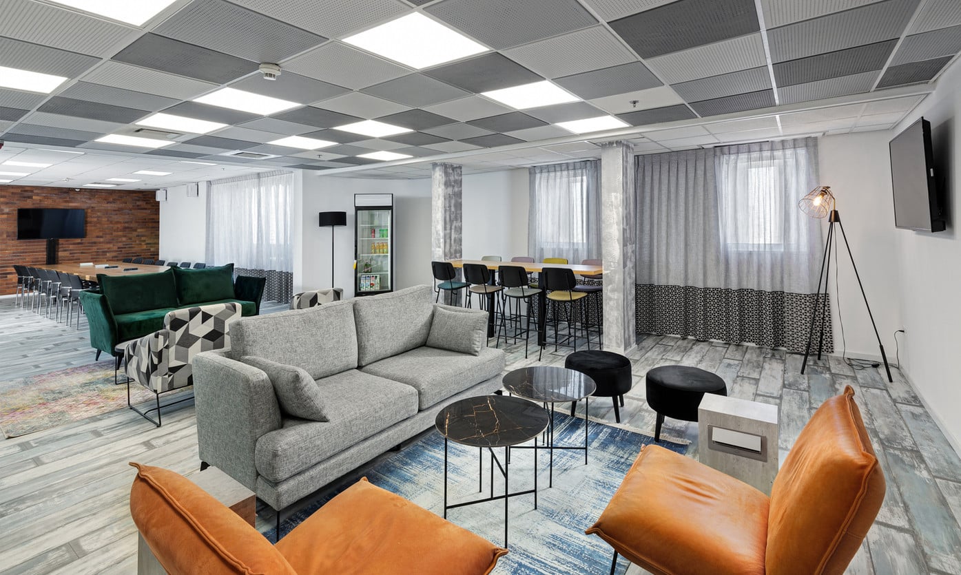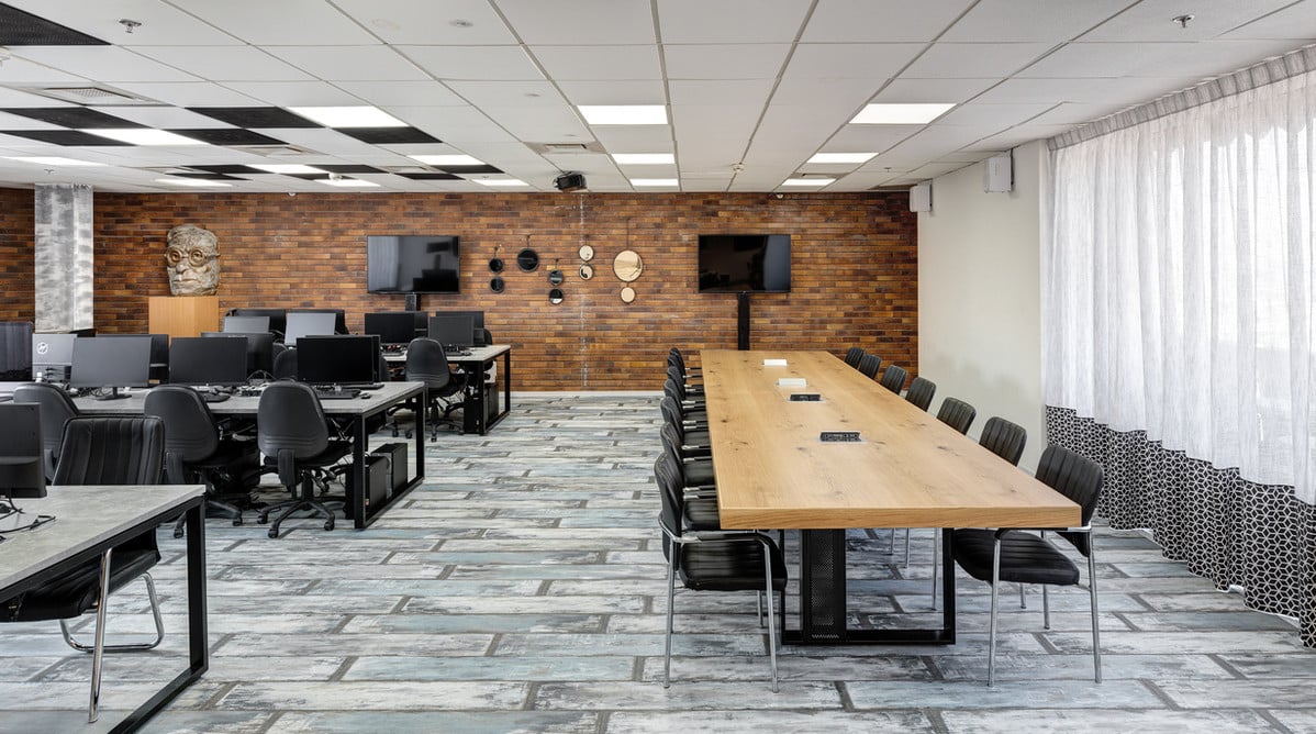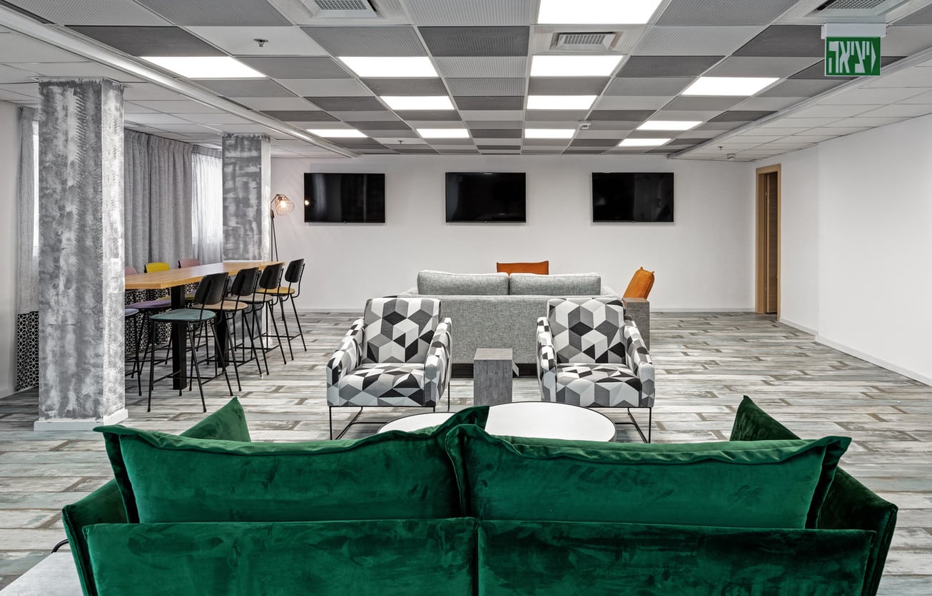 התבקשנו לעצב את חלל ה-OPEN SPEACE כחלל מודולרי בו פינות ועמדות עבודה מגוונות, שולחן ישיבות ו-2 פינות סלון.לטובת העניין נשברו כל הקירות והרצפה חופתה בפרקט צבעוני בנראות צעירה, דינמית ותוססת. בנוסף, הוזמנו שולחנות עבודה מובנים שתשתית החשמל עוברת דרכם, כך הצלחנו לשמור על נראות אסתטית ונקיה. התקרה האקוסטית נצבעה בגוונים שונים על מנת להדגיש את ההפרדה בין האזורים. הקירות מרושתים במסכי טלוויזיה.