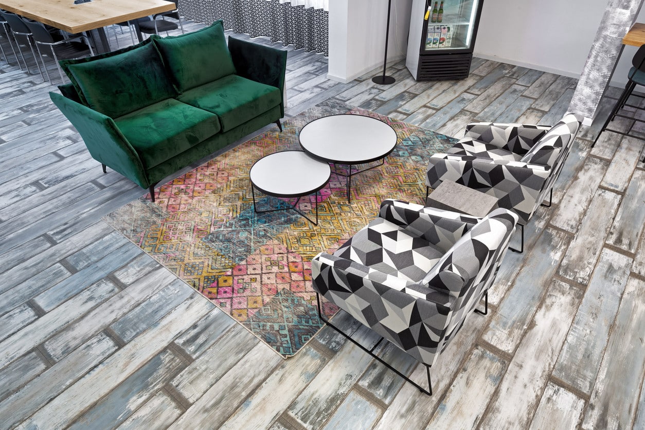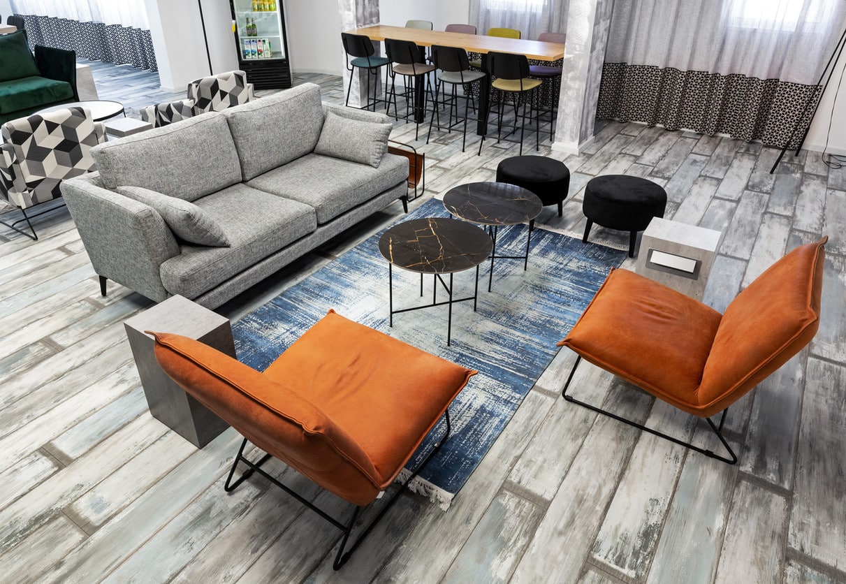 הוילונות שנבחרו משלבים בין צבעוניות בהירה בחלקם העליון וכהה בחלקם התחתון שיוצרים יחד אשליית גובה. ארבעת העמודים הקונסטרוקטיבים נצבעו בגוונים אפורים בצביעה חופשית, זאת על מנת להותירם פרקטיים בחלל אליו מגיעים בממוצע בין 100 ל-200 אנשים ביום. כך הם מצליחים להסתיר את הבלאי ולהכלוך שמצטברים על גבם באופן טבעי.