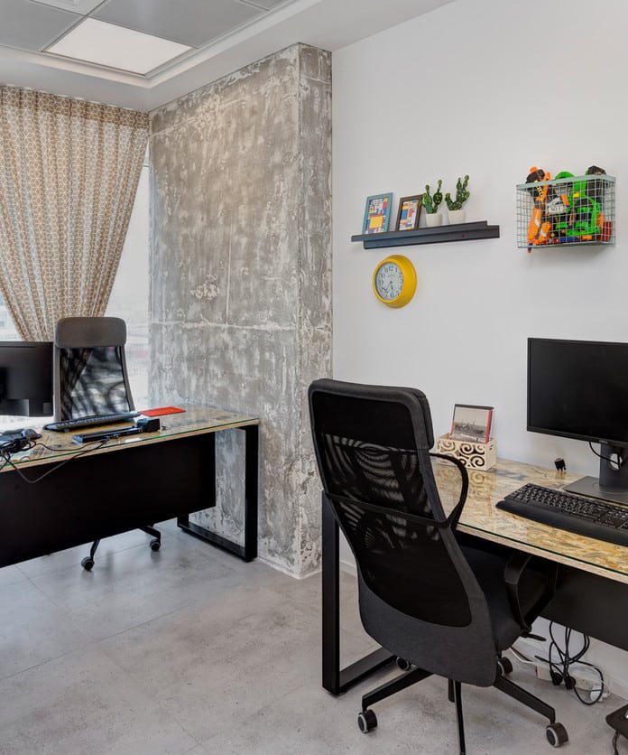 החללים במרחב המשרדי נטולי היררכיה. כל עובד קיבל מרחב עבודה גדול, מפנק ומאובזר. בתוך כך יצרנו שני חללים מרכזיים: האחד לישיבות בו גם דלפקים הפונים לכיוון הנוף ומשמשים את העובדים להפסקות צהריים או ישיבות מצומצמות. השני, חדר FUN מעוצב שמאפשר לצוות להתנתק משגרת היום, לאגור כוחות ולצבור רעיונות והשראה. חלל זה כולל עמדות פלייסטיישן, קונזולות משחקים, ועמדת בר שתוכננה מחלקי פחחות של רכב ישן.