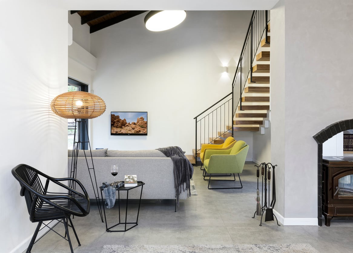 גרם המדרגות הישן לא עמד בתקן. רום המהלך היה גבוה מהמותר ולא נוח לשימוש. שינינו את צורת המדרגות לגרם בצורת האות L שיוצר נראות אוורירית ומרחפת. ככלל, ברחבי הבית שולבו אלמנטים גיאומטרים בצורניות תלת מימדית ונגיעות צבע שמייצרות הדגשים בחלל.
