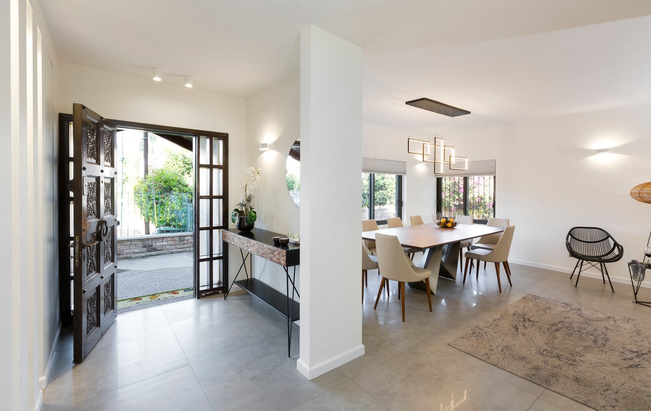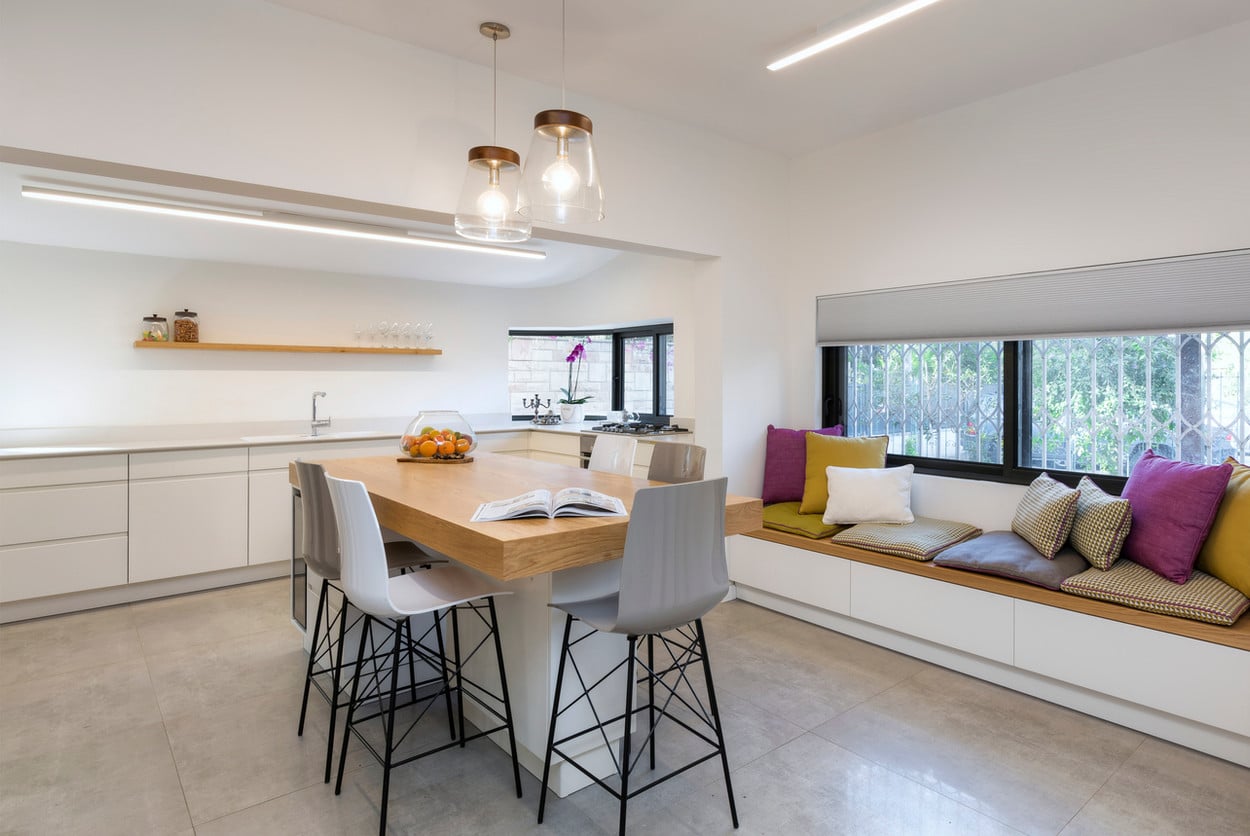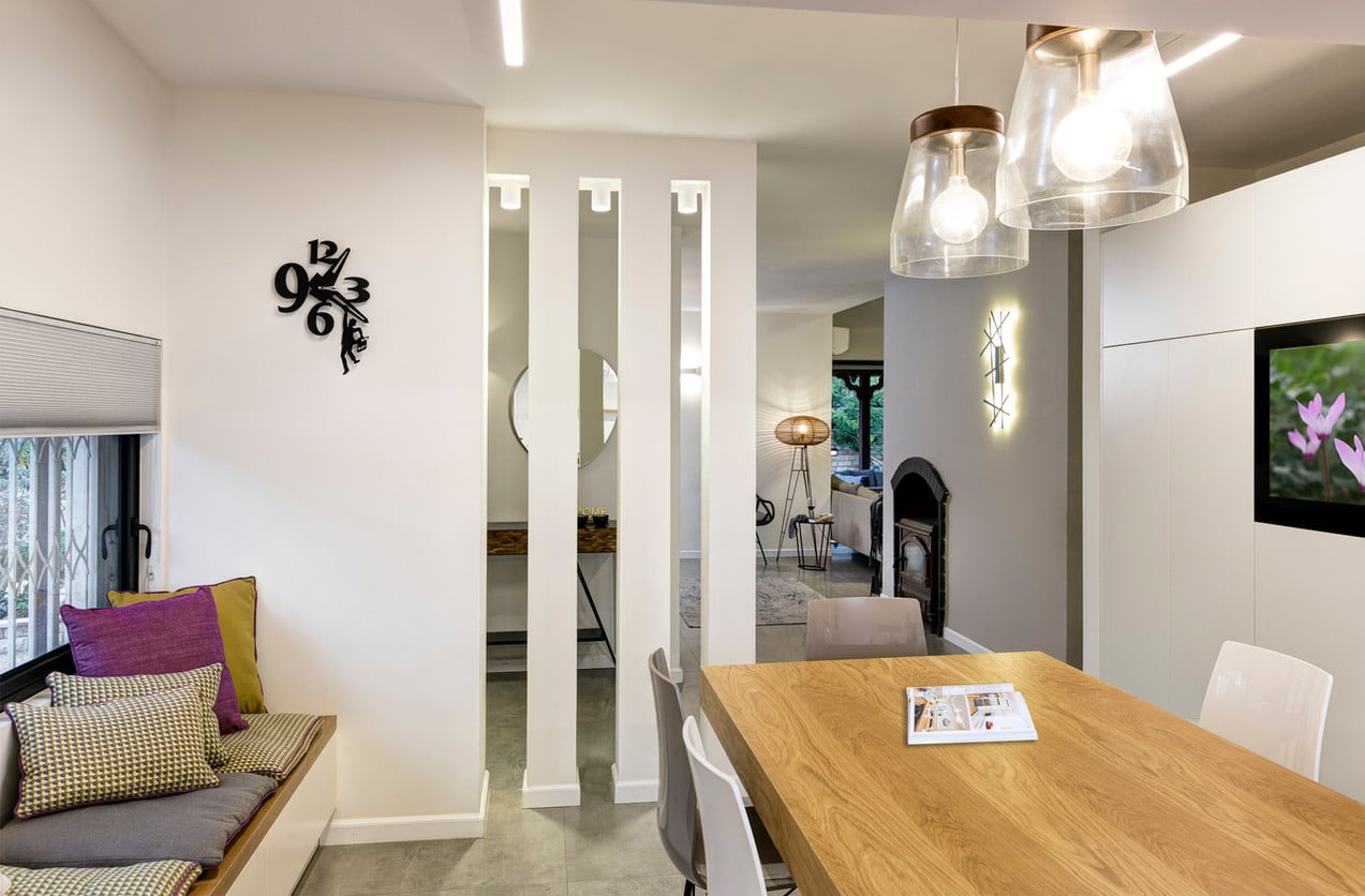 לפני השיפוץ, הבית היה מיושן ומוזנח, עם קירות שפריץ, מרצפות סומסום וחלונות כהים שחסמו את התצפית החוצה, מה שגרם לו להיות חשוך וקטן יותר מכפי שהוא. בתכנון החדש, יצרנו חללים שאינם נגלים באחת אלא בשלבים. הפונקציות השונות בחלל הציבורי (פינת האוכל, הסלון והמטבח) תחומים כיחידות נפרדות ועדיין גלויים חלקית, כך שהפקנו תחושה נעימה ואינטימית בכל אחד מהם.