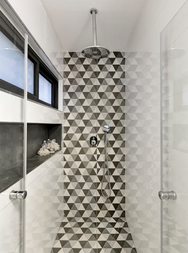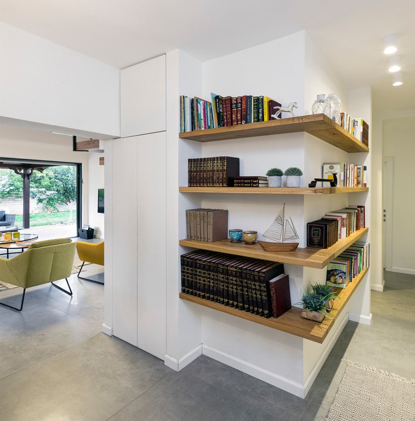 גרם המדרגות הישן לא עמד בתקן – רום המהלך היה גבוה מהמותר ולא נוח לשימוש. שינינו את צורת המדרגות לגרם בצורת האות L, שמייצר נראות אוורירית ומרחפת. כחלק מהעיצוב הכללי, ברחבי הבית שולבו אלמנטים גיאומטריים בצורניות תלת-מימדית, ונגיעות צבע שמייצרות הדגשים בכל אחד מהחללים, מה שהעניק לבית מראה מודרני לצד תחושת חום וביתיות.