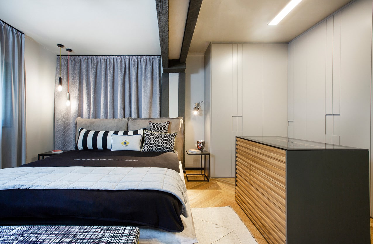 בקומת הכניסה, שיפצנו את כל החלל ויצרנו עיצוב פנים מודרני, תוך תכנון דירה בתל אביב מתאים לאורח החיים של בני הזוג שהבן המתבגר. הרחבנו את המטבח ואת הסלון ויצרנו פינת אוכל יומיומית במרחב המטבח כדי להגביר את תחושת המרחב. תהליך שיפוץ הדירה כלל גם יצירת סוויטת הורים גדולה ומפנקת, תוך שילוב פתרונות אחסון יצירתיים.