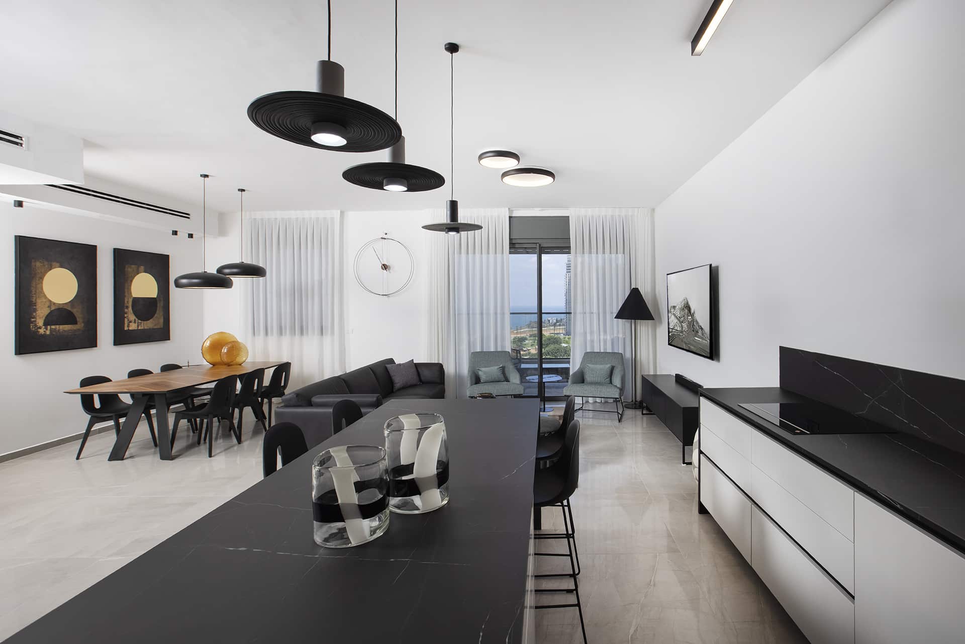 לבחירת השיש היה חלק חשוב בתהליך, במיוחד במטבח. בחרנו בשיש גרניט פורצלן, חומר שמציע שילוב מצוין של פרקטיות ויוקרה. הגרניט פורצלן עמיד לאורך זמן, קל לניקוי ומספק מראה יוקרתי ונקי. הבחירה בחומר הזה הייתה על מנת לשמור על תפקוד גבוה ואסתטיקה נאה לאורך שנים, תוך שמירה על פרקטיות רבה.