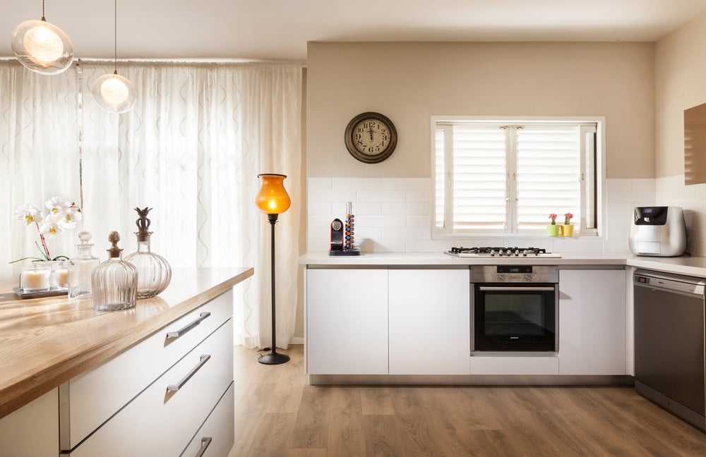 - החלפת ארונות המטבח בחדשים בעיצוב עכשווי ושילוב מקומות אחסון נוחים.
