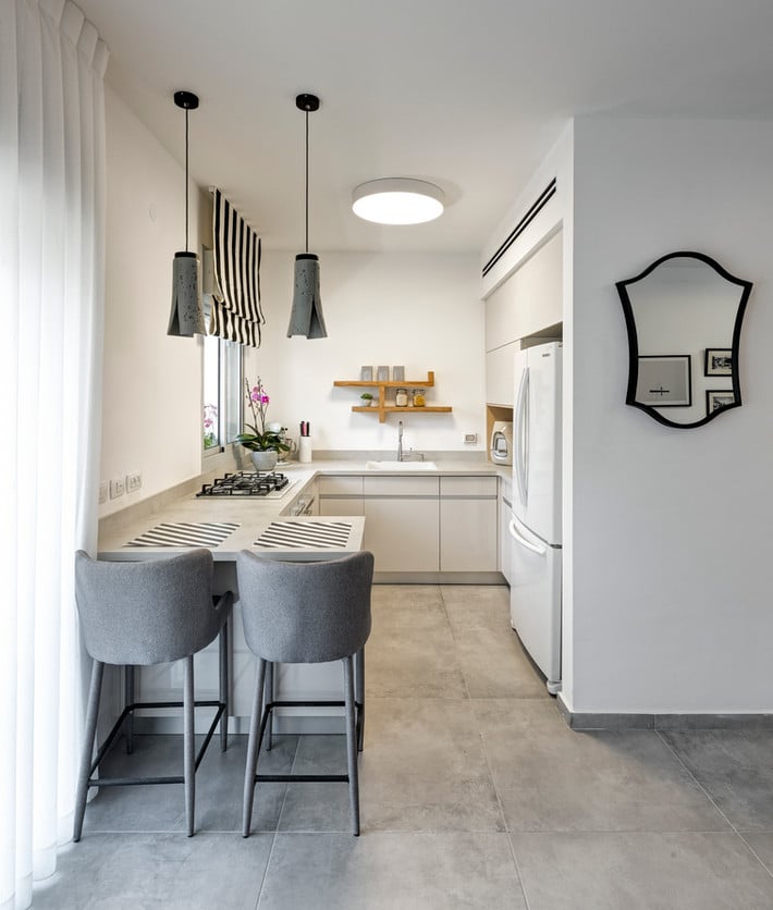 הדירה נקנתה על הנייר, ולכן יצאנו לפגישה עם צוות הקבלן, שם בחנו את אפשרויות השינוי ושדרוג הדירה. לדוגמה, שינוי במיקום המטבח על מנת לפתוח את החלל ולהפוך אותו למרווח יותר. בנוסף, בחרנו חיפויים וריצופים חדשים, פרטי ריהוט, אקססוריז וטקסטיל – כל פרט הותאם לצרכים האישיים של הלקוחה.