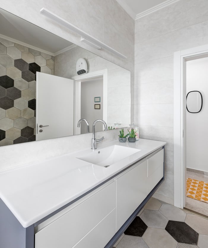 - הרחבנו את חדר הרחצה על חשבון שטח מחדר השינה, מבלי לפגוע בתחושת המרחב.
