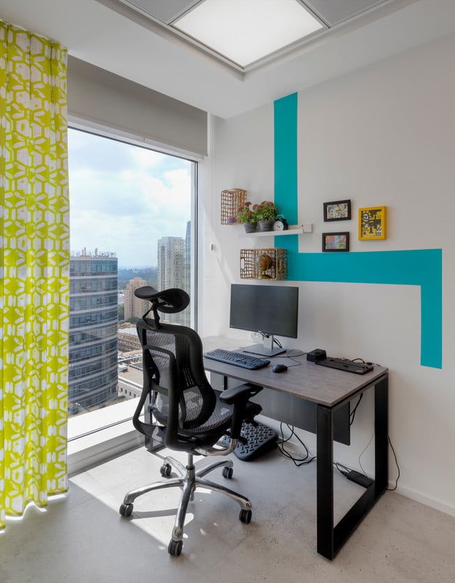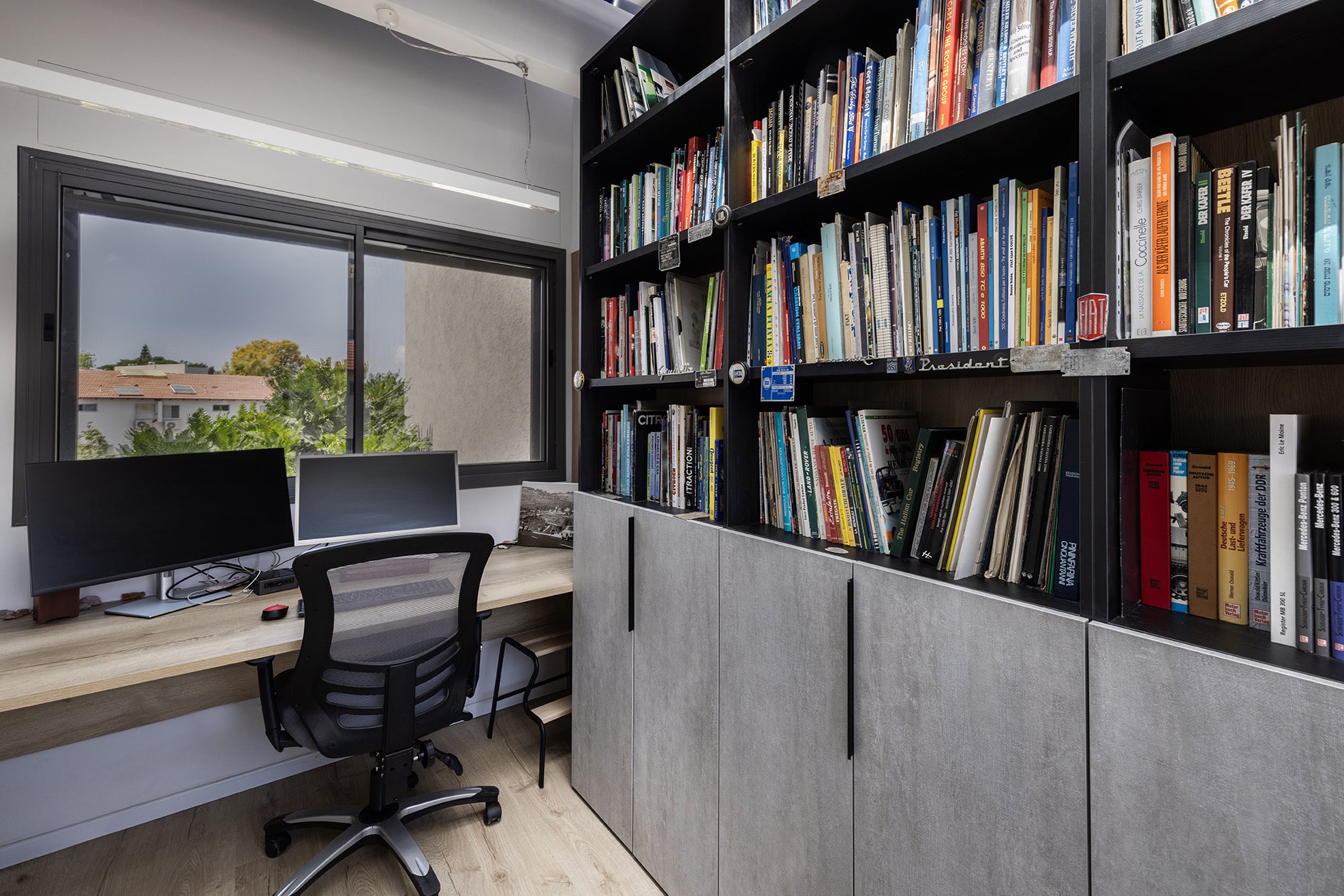 כחלק מתהליך התכנון נבחן את המיקום האופטימלי של חדר העבודה כך שיטמע בבית באין מפריע למהלך העבודה השוטפת או הפרעה לבני הבית שמתנהלים מחוצה לו.